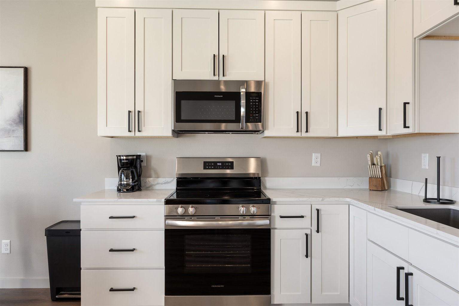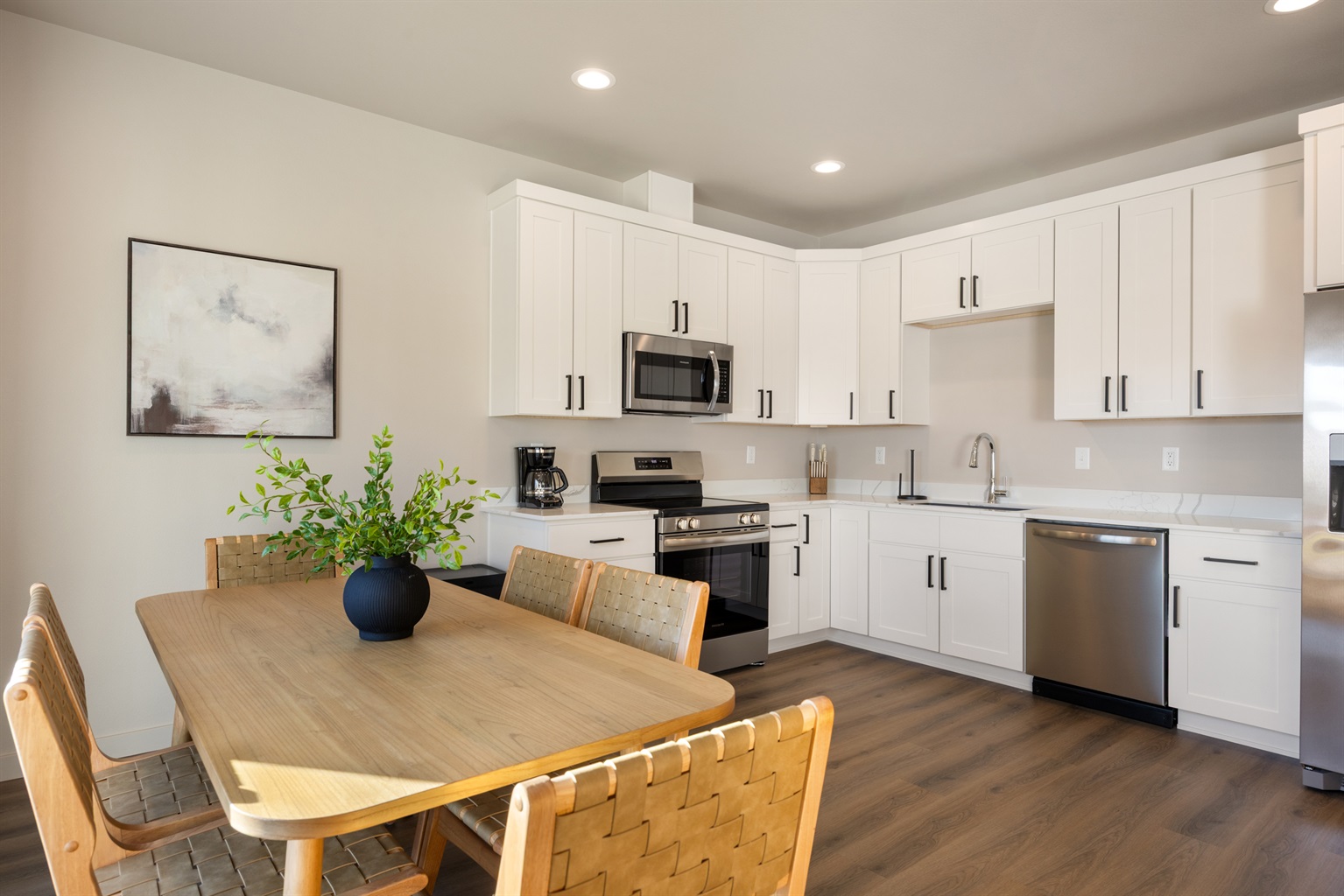 The kitchen includes stainless-steel appliances—a refrigerator with ice and water dispenser, dishwasher, range, and microwave—as well as quartz countertops, a large pantry, and all the everyday essentials such as cookware, dishes, utensils, and a coffee maker. The main level has laminate flooring throughout, paired with 9-foot ceilings that enhance the open layout. A washer and dryer are included.